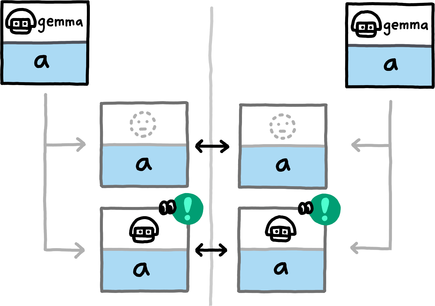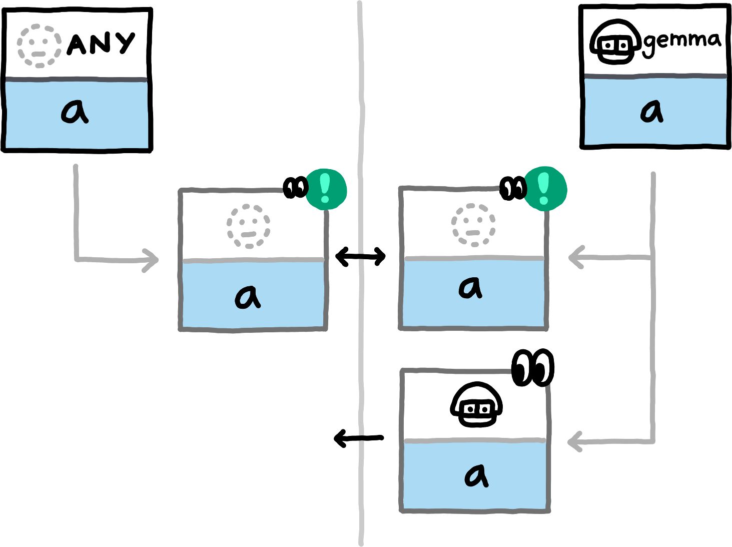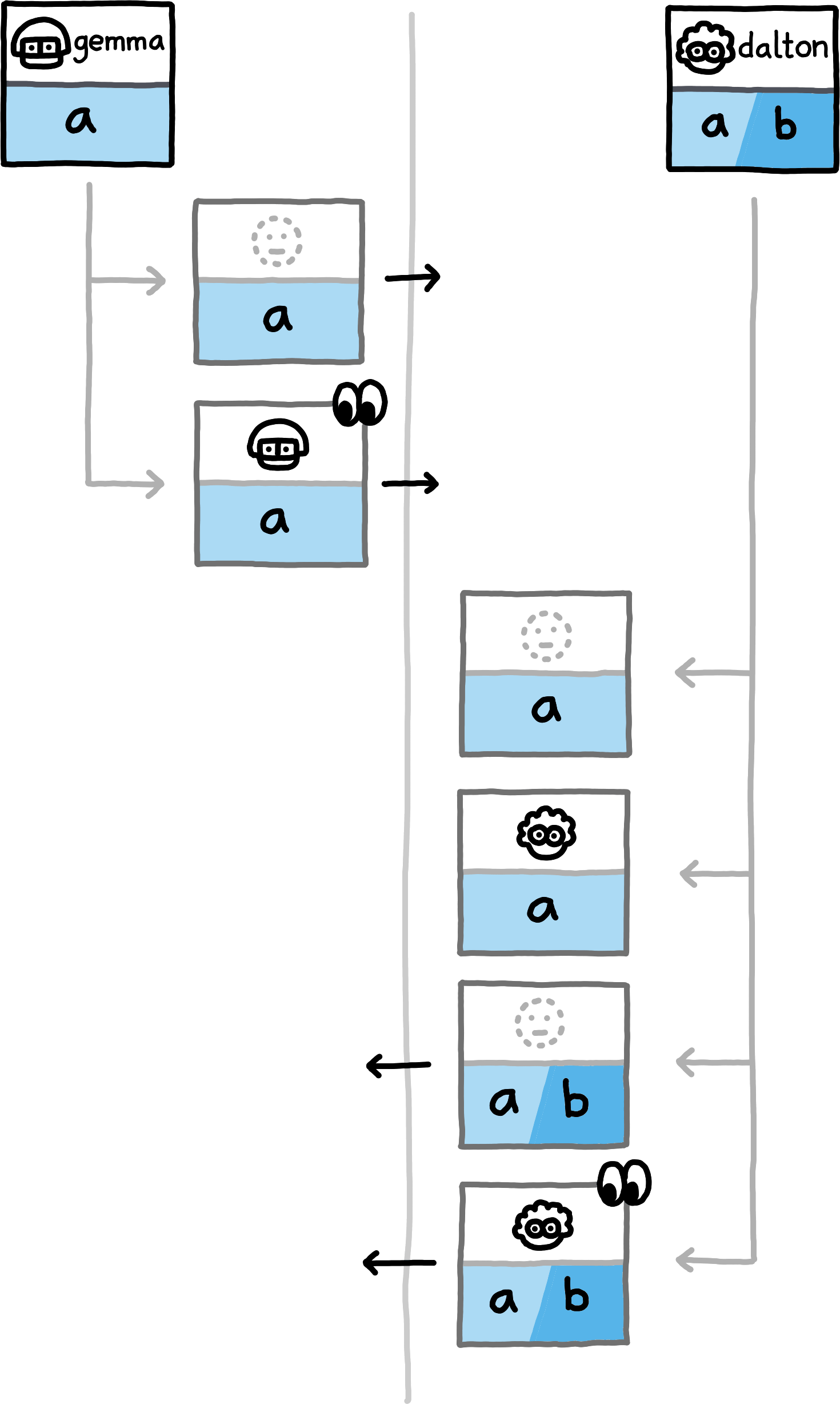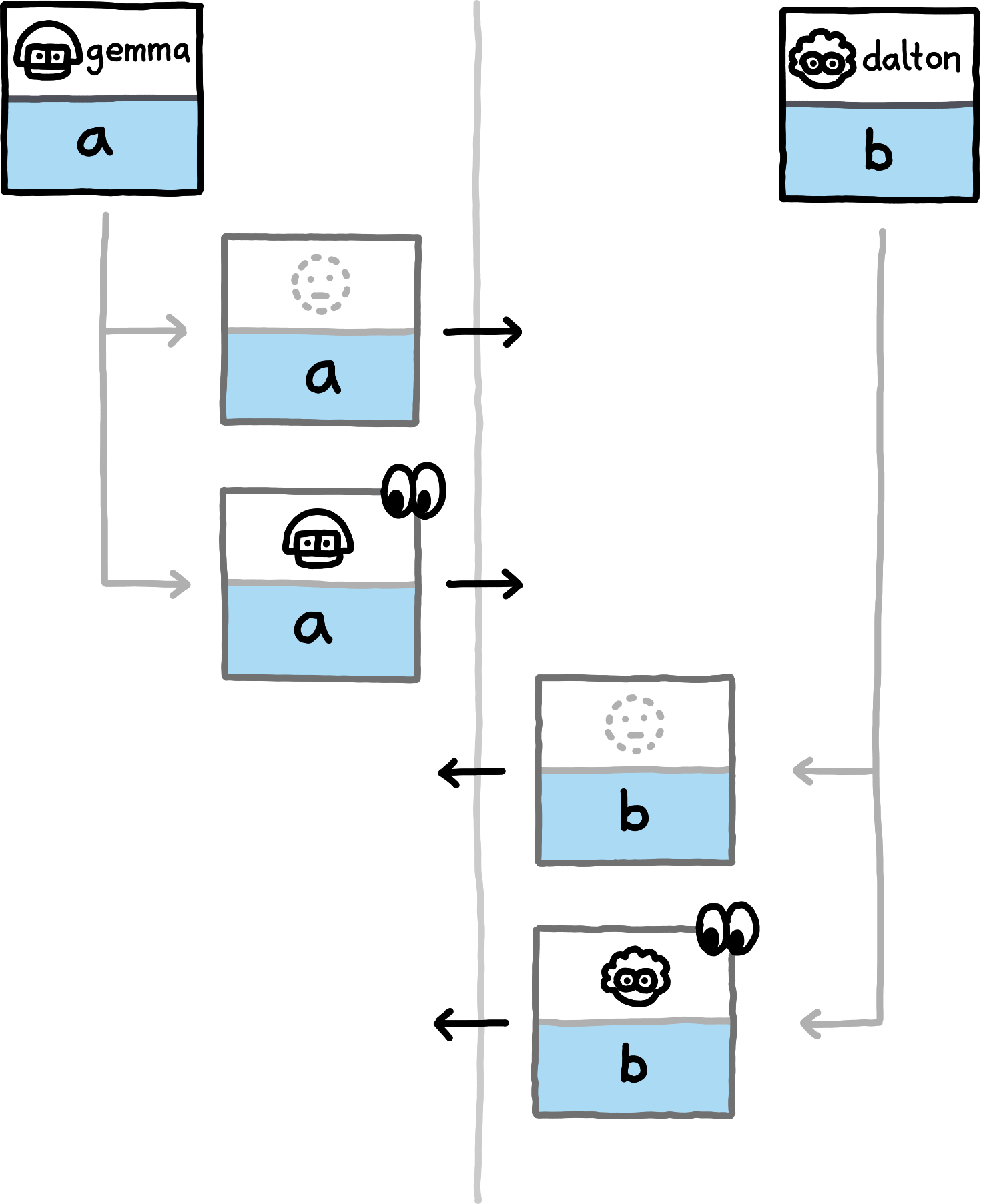 A comic showing two characters creating hashes of a common piece of information using their own salt. When they receive each others' hashes, they compare it with a hash generated using their partner's salt.Telling a peer directly about which Areas in which namespaces you are interested in leaks NamespaceIds, SubspaceIds, and Paths. Instead, the peers merely transmit secure hashes of certain combinations of these. Intuitively, if both peers send the same hash, then they both know that they are interested in the same things. This is easily attackable however: one peer can simply mirror back hashes sent by the other, tricking them into beleaving that they have shared knowledge. For this reason, each peer is assigned a random bitstring to use as a salt for the hash function. A peer transmits hashes salted with its own salt, but compares the hashes it receives against hashes that it computes locally with the other peer’s salt.